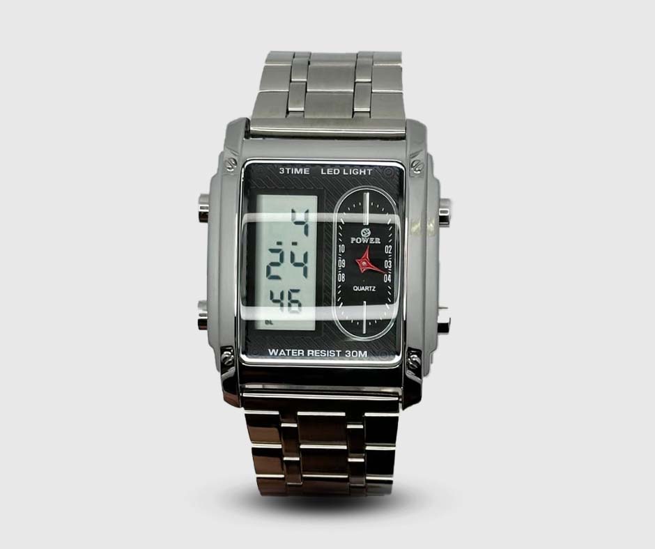 Includes analog digital display, date, alarm, and stopwatch. Perfect combination of style and functionality.